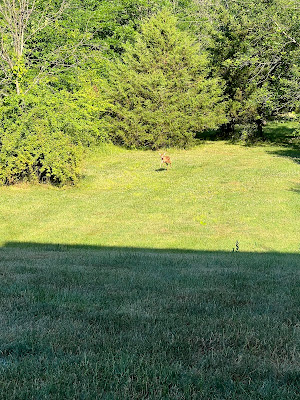 We were just talking about not seeing deer in our yard recently...and then... the one baby followed his momma the other one decided to run towards us...bad idea little one - run the other directions - unless of course you want to play with two scary puppies!